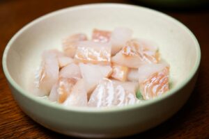 - Snijd de kabeljauw in grove stukken van circa 3×3 cm.