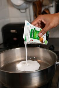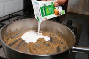 - Schud de kokosmelk en doe een scheutje (ca. 1/3 van het pak) in de pan.