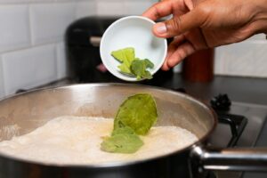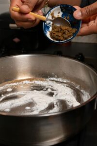 - Laat de kokosmelk indampen tot je grote bellen ziet (als je met een spatel een streep trekt, dan moet de streep zichtbaar blijven).