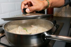 - Doe de kabeljauw stukken bij de currysaus en roer voorzichtig, totdat alle stukjes vis bedekt zijn met saus. De stukken vis moeten ongeveer half onder het vocht staan. Voeg eventueel een scheutje water (uit het pakje kokosmelk) toe.