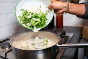 - Voeg de currypasta toe aan de ingedikte kokosmelk. Bak de curry pasta voor 1 minuut en roer constant totdat de aroma’s van de curry pasta vrij komen.