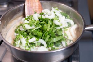 - Na 6 minuten, of wanneer de kabeljauw net gaar is, voeg je de rauwe paksoi door de curry. Schep de paksoi heel voorzichtig door de saus. Let op: de kabeljauw is erg delicaat.