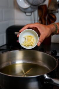 - Pel de twee teentjes knoflook en hak tot fijne stukjes.