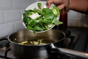 - Bak de paksoi ongeveer 2 tot 3 minuten, totdat de witte stengels beetgaar zijn.