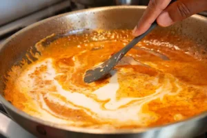 - Voeg de currypasta toe aan de ingedikte kokosmelk. Bak de curry pasta voor 1 minuut en roer constant totdat de aroma’s van de curry pasta vrij komen.