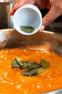 - Voeg de vissaus, palmsuiker en limoenbladeren* toe aan de curry saus en roer alles nog een keer goed om.