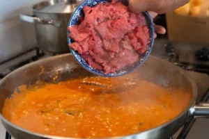 - Breng het geheel weer zachtjes aan de kook en laat alles nog goed doorwarmen totdat de biefstuk mals is.