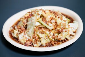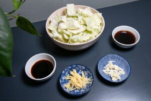 In dit recept, als bijgerecht, laten we de spek achterwege. In plaats daarvan voeg ik een beetje gember toe voor een beetje pit en frisheid. Zelf houden we er van als de spitskool nog een beetje een byte heeft. Dat geeft namelijk een lekkere textuur met de zacht gestoomde rijst en curry’s. De saus van oestersaus en sojasaus combineert ook nog eens erg lekker met witte rijst.