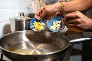 - Pel de twee teentjes knoflook en hak tot fijne stukjes.