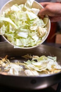 - Doe de spitskool in de pan en bak al roerende totdat de spitskool glanzend en een beetje zacht is geworden.