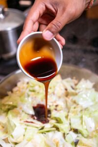 - Doe de sojasaus, oestersaus en twee eetlepels water bij de spitskool. Roer alles goed om en zet daarna het vuur op een middellaag pitje.